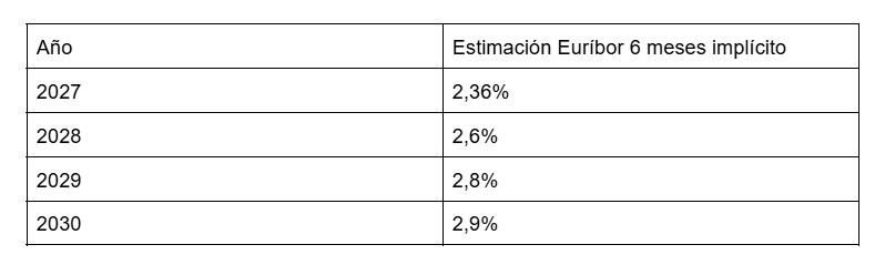 Para que lo puedas ver de forma clara, te mostramos una tabla de las estimaciones del Euríbor en el período 2027 - 2030.