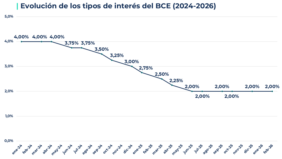 En 2025, esta tendencia continuó con reducciones desde el 2,75% en enero hasta el 2% en junio, estableciendo un nivel predecible y estable. Desde entonces, hasta la reunión de febrero de 2026, los tipos se han mantenido en el 2%, reflejando un mensaje de prudencia y consolidando la estabilidad para hogares y empresas, con previsibilidad para hipotecas variables y continuidad en la política monetaria del BCE.